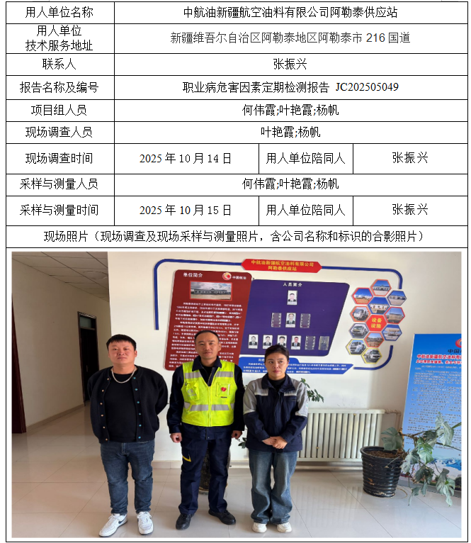 中航油新疆航空油料有限公司阿勒泰供应站职业病危害因素定期检测
