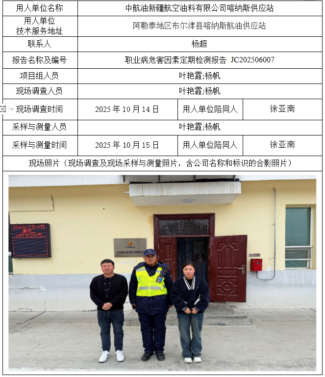 中航油新疆航空油料有限公司喀纳斯供应站职业病危害因素定期检测