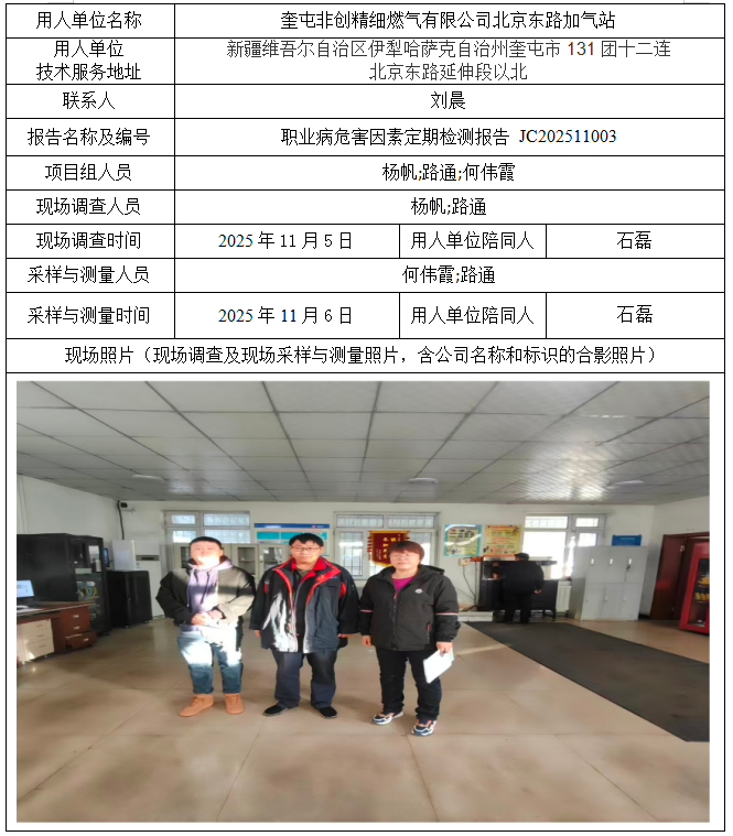 奎屯非创精细燃气有限公司北京东路加气站职业危害因素定期检测