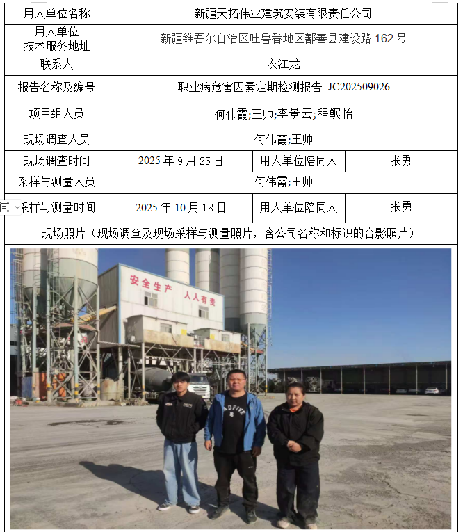 新疆天拓伟业建筑安装有限责任公司职业病危害因素定期检测
